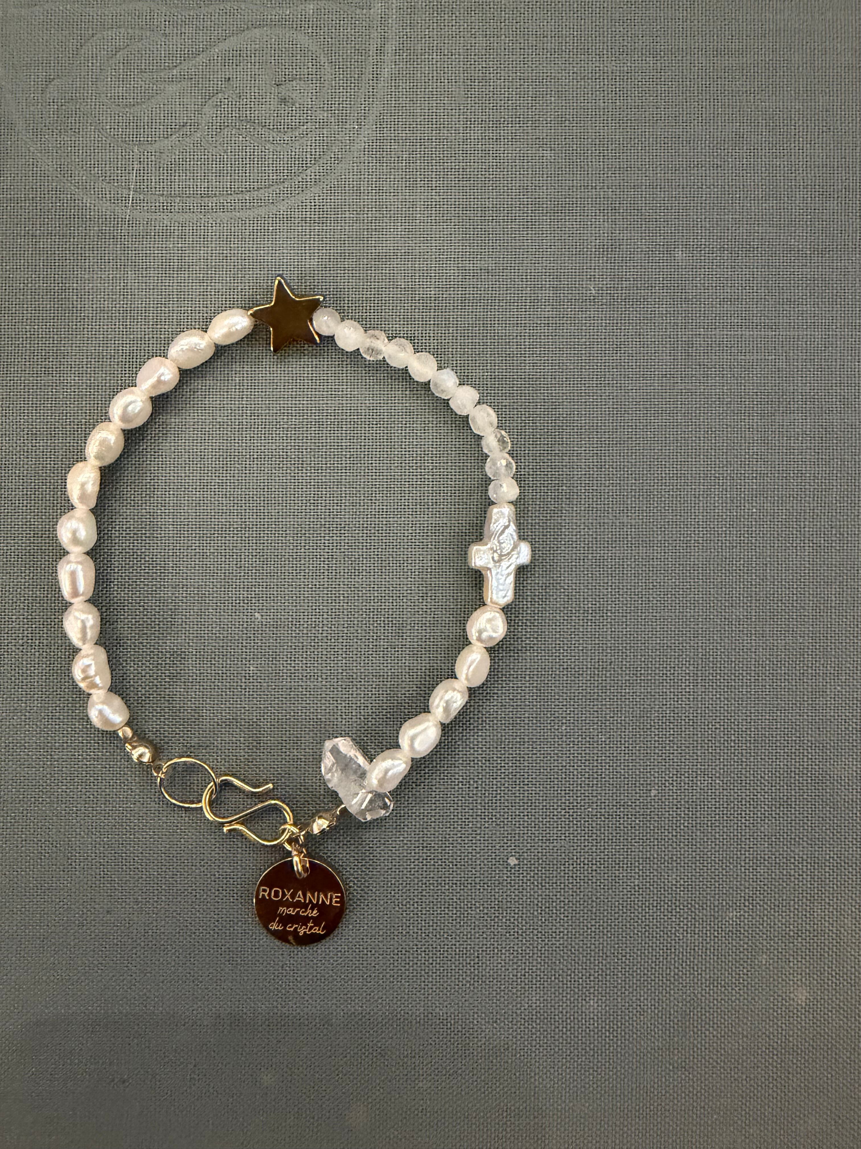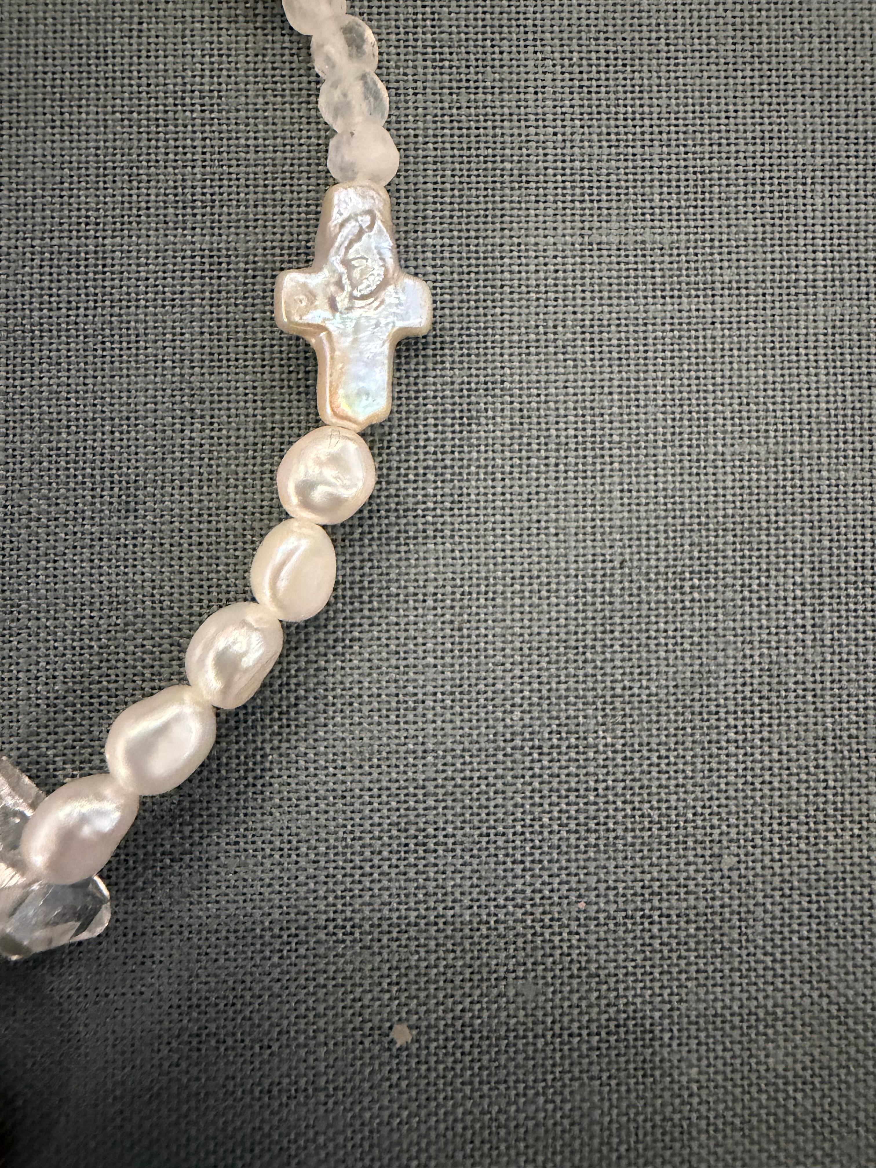 一粒、クリアな極小のダイアモンドクリスタルとクロス型のパールも